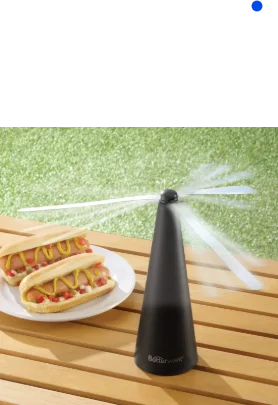 Mantiene alejadas a las moscas de tus alimentos y bebidas gracias a sus aspas giratorias que crean una barrera invisible que impide que los insectos se acerquen.
